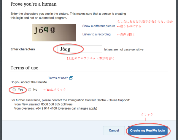 画面に表示されている文字を入力して下さい。分かりにくいようでしたらShow adifferent pictureをクリックして違う文字を表示することも出来ます。Create my RealMe loginをクリックします。ユーザーネーム、メールアドレス、セキュリティの質問の答えは必ず、わかるようにしておきましょう。間違っていないか確認してください。