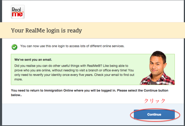 Eメールが届いていますので、ご確認下さい。Continueで申請を続けます。