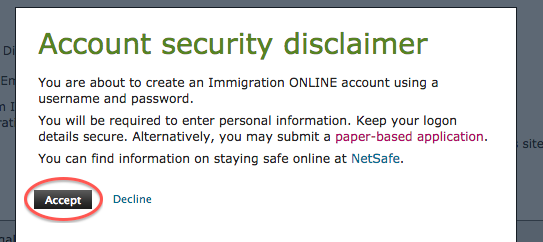 学生ビザ申請に関して、アカウントのセキュリティに対するものです。オンラインでの申請ではセキュリティが不安だと思われる方は、紙媒体での申請でも可能です。そのままオンラインで申請する方はAcceptをクリックし、先へ進みます。