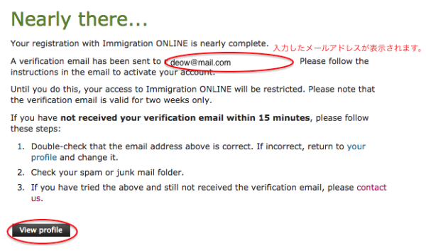 入力したEメールが表示されます。メールは2週間有効ですので、その期間中にメールにあるインストラクションに従って登録を完了してください。