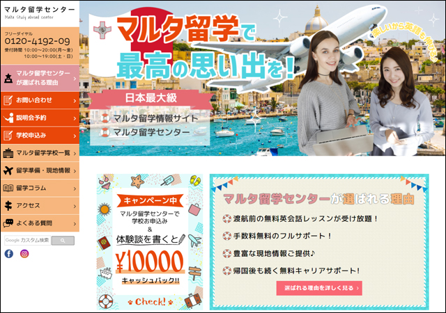 最近留学先として人気のあるマルタ。マルタ留学センターはそんなマルタの学校や現地情報をご案内している留学情報サイトです。ご案内しているマルタの学校は20以上。美しい街並みが魅力的なバレッタや自然豊かなゴゾ島など4地域の学校を詳しくご紹介しています。また、現地生活で必要となる知識や、マルタを観光する際に訪れるべき場所など、留学生活を充実させるための情報も多数そろえております。